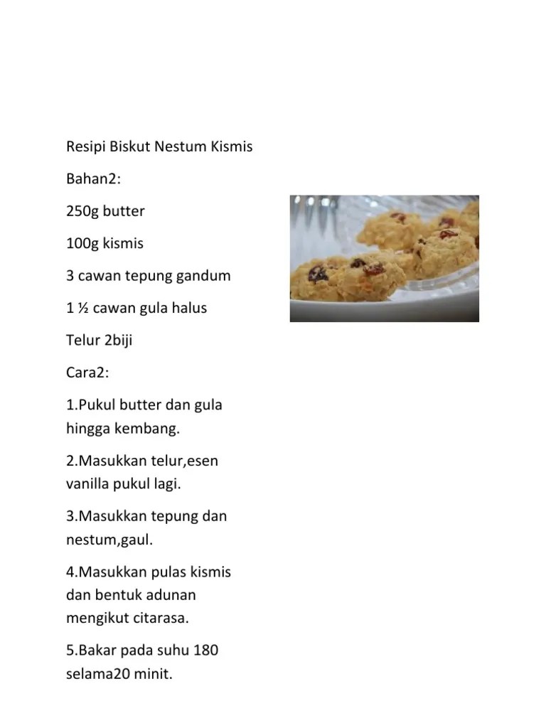 Akhir sekali, masukkan kismis dan bubble rice. 1/2 blok mentega (1/2 block butter) 3/4 cawan gula halus (3/4 cup fine sugar) 1 biji telur (1 egg) 1 sudu kecil . 4 cawan tepung gandum 1/2 . Masukkan tepung dan soda bikarbonat yang telah diayak. Resipinya guna sukatan cawan jadi lagi mudah nak buat. Biskut almond london sukatan cawan. Posted at 08:34h in by nina mirza 0 comments · resipi biskut raya oat kismis mudah sukatan . 1 buku butter (250gm) 1 . Biskut makmur gebu, sedapnya cair di mulut: Resepi biskut ni juga boleh menggantikan kismis dengan mix fruits. Buat yang jaga diet, boleh laa try.